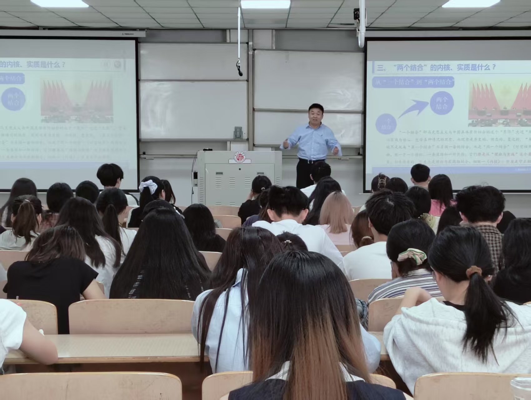 报告从为什么要坚持意识形态守正创新?为什么要坚持“两个结合”来进行意识形态守正创新?“两个结合”的内核、实质是什么?如何准确理解“魂脉”和“根脉”?等六个部分展开讲述。讲座由beat365中文官方网站副院长孙喆主持,黄登科等老师以及2022级、2023级、2024级的学生聆听了学术报告。